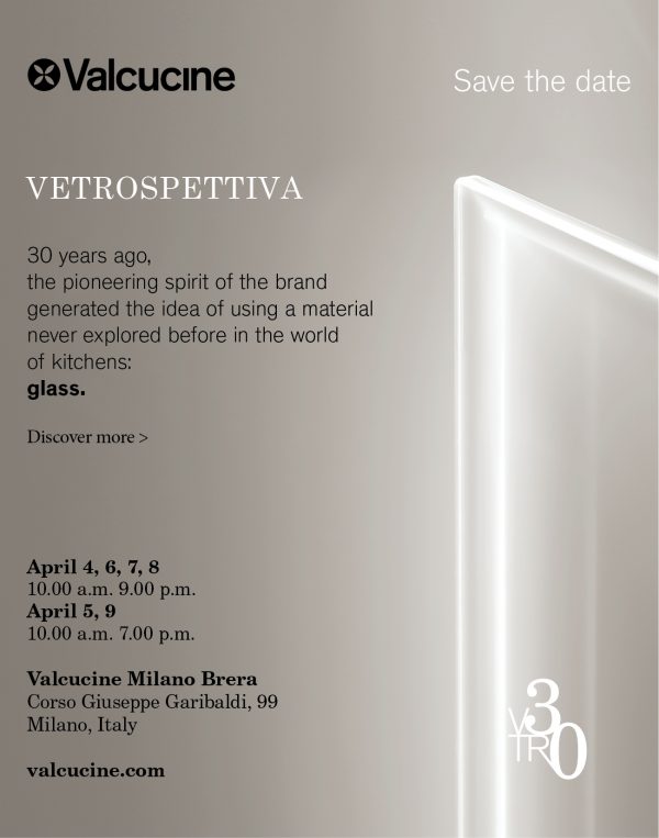 1. A neologism coined for the celebration of the 30-year anniversary of the first glass kitchen, to investigate the events that prefigured and lead to the introduction of the use of glass in the kitchen industry and that established the current conditions that allow glass to be the primary material employed to design and construct Valcucine’s masterpieces.