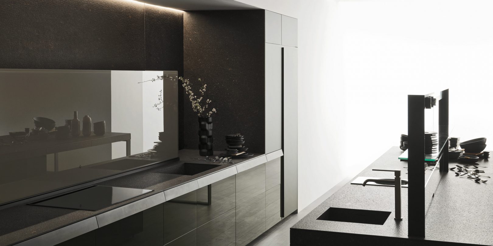 Keen research into materials is essential for Valcucine, a company with a passion for design creativity and ongoing technological renewal. Just as if you were using a car configurator, over 300 finishes can be applied with a simple touch on “MACHINA, the Ultimate Kitchen Configurator” >> Go >> Start to customise the kitchen