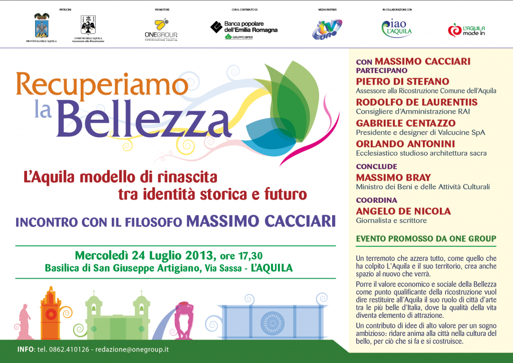 Domani, mercoledì 24 luglio 2013 alle 17,30 alla Basilica di San Giuseppe Artigiano in via Sassa a L’Aquila si terrà il convegno “Recuperiamo la bellezza. L’Aquila modello di rinascita tra identità storica e futuro“, ideato dalla presidente della società One Group Comunicazione Francesca Pompa e patrocinato dall’assessore alla Ricostruzione Pietro Di Stefano.