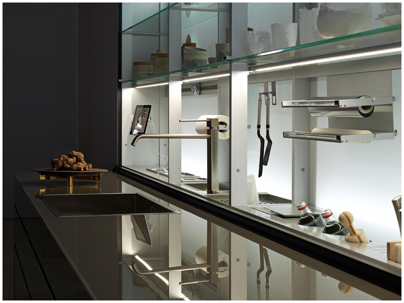 Il 30° anniversario della prima cucina in vetro Valcucine, vede la sua massima espressione nella collezione Artematica che qui prende vita con Air Logica System e V-motion System. Un semplice gesto della mano apre l’anta e il rubinetto e accende le luci dello schienale, variandone il colore. Tutte le ante e la boiserie sono in elegante vetro grigio fuoco fra le quali spicca l’anta del pensile Air Logica System in vetro grigio fuoco lucido, impreziosito dalla grafica “Ali di farfalla”, capace di evocare la leggerezza del volo grazie alla sua apertura “magica” determinata da un semplice gesto della mano. Artematica a penisola con l’elemento speciale New Logica System è un modello di cucina rivoluzionario in cui l’arte del gioco di colori e materiali si incontra con la matematica dei volumi puri.