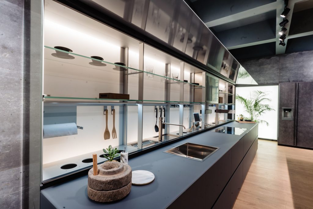 Lo spazio si sviluppa su 200 metri quadrati e al centro degli allestimenti, la tecnologia con le sorprendenti funzionalità degli Elementi Speciali, elementi distintivi Valcucine, che ripensano lo spazio per favorire la massima libertà dei movimenti in cucina. Ecco l’estrema leggerezza del Pensile Aerius e le aperture magiche di New Logica System e Air Logica System. Grazie al sistema intelligente brevettato V-Motion, il semplice gesto della mano contemporaneamente apre l’anta, aziona il rubinetto e accende le luci dello schienale.
