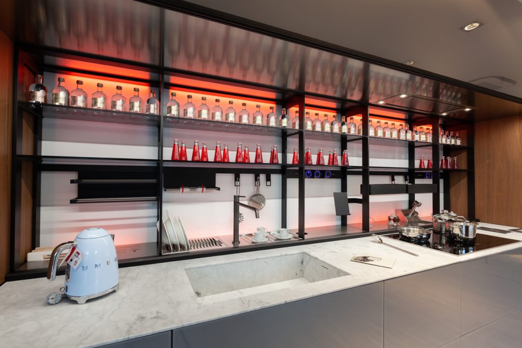 A centro di tutto Logica Celata, disegnata da Gabriele Centazzo. Frutto di un’ingegnosa ricerca volta a ripensare lo spazio e reinventare l’ergonomia, 2C Arredamenti la presenta nella versione cucina che, assieme alla versione bar, completa i modelli disponibili.