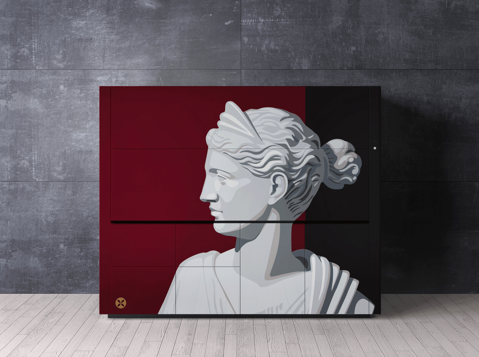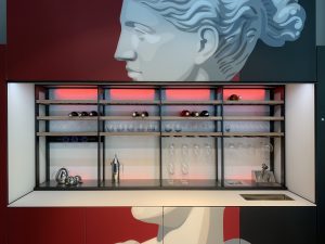 Una volta chiusa, Logica Celata si trasforma in un elegante elemento di arredo, reso ancora più prezioso dalla personalizzazione Vitrum Arte, speciale tecnica sviluppata da Valcucine per riprodurre su vetro vari disegni a intarsio. Come un quadro di grande suggestione, sulla superficie del bar rivive Demetra che nella mitologia greca è la dea del grano e dell’agricoltura, artefice del ciclo delle stagioni, della vita e della morte. L’opera vuole essere un omaggio alla civiltà greca che per prima si è posta le grandi questioni esistenziali, dall’origine del mondo al senso della vita, dal valore della bellezza alla via per la felicità.