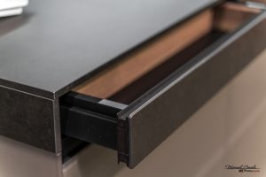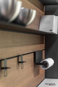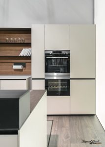 Assoluto (sull’isola) e boiserie in Noce Tattile. La cucina è dotata di Logica Theca, il nuovo canale attrezzato, un elemento contenitivo chiuso da un’unica anta, perfettamente integrabile nel piano di lavoro, dentro cui riporre piccoli utensili, contenitori, prese di corrente e molto altro ancora.
