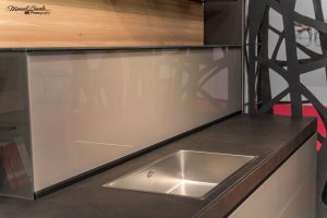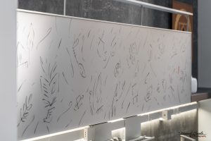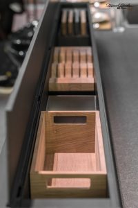 La cucina Forma Mentis nella composizione lineare con colonne, caratterizzata da Logica Theca altezza 1 cm in alluminio e dal Pensile Aerius che presenta un’apertura basculante leggera e silenziosa, dotata di un’anta ultra sottile che sfrutta la forza di gravità tramite la struttura con bilanciere, personalizzato con Vitrum Arte, speciale tecnica sviluppata da Valcucine per riprodurre su vetro vari disegni a intarsio.