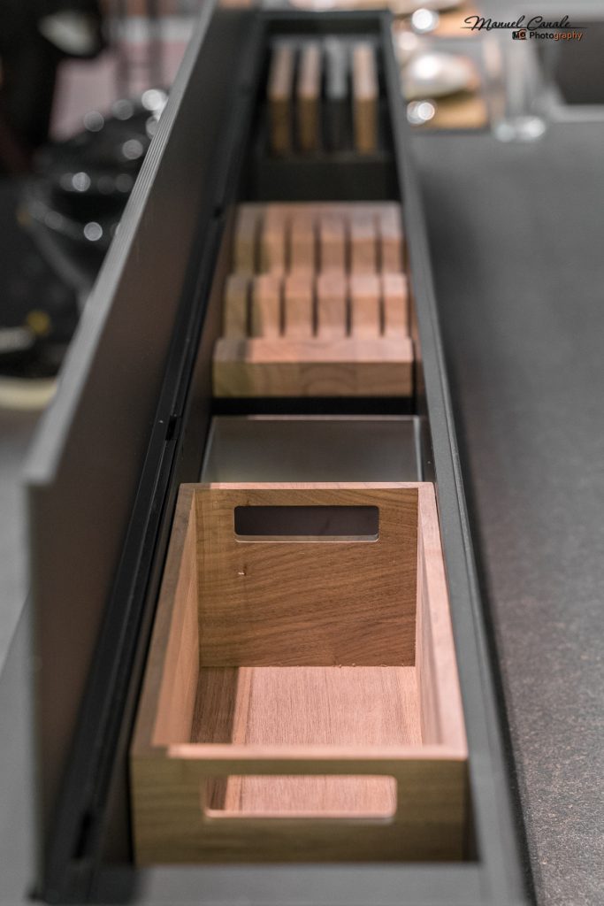 Assoluto (sull’isola) e boiserie in Noce Tattile. La cucina è dotata di Logica Theca, il nuovo canale attrezzato, un elemento contenitivo chiuso da un’unica anta, perfettamente integrabile nel piano di lavoro, dentro cui riporre piccoli utensili, contenitori, prese di corrente e molto altro ancora.