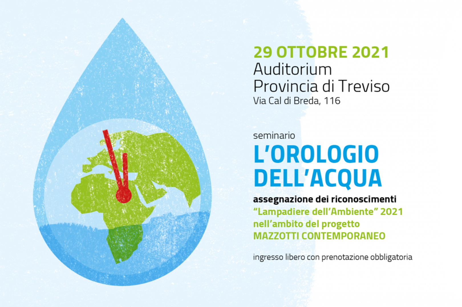 All’Auditorium Sant’Artemio – Provincia di Treviso il Premio Mazzotti, assieme al CAI – Club Alpino Italiano e al Touring Club, organizza, dalle 9.00, il seminario “L’orologio dell’acqua”: una intera giornata di riflessione e di proposta di soluzioni, che prevede anche l’assegnazione del Premio “Lampadiere dell’ambiente” a coloro che oggi sposano i valori e perseguono le battaglie di Giuseppe Mazzotti, ecologista con cinquant’anni d’anticipo.